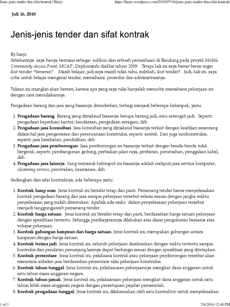 Jenis Jenis Tender Dan Sifat Kontrak Harjo